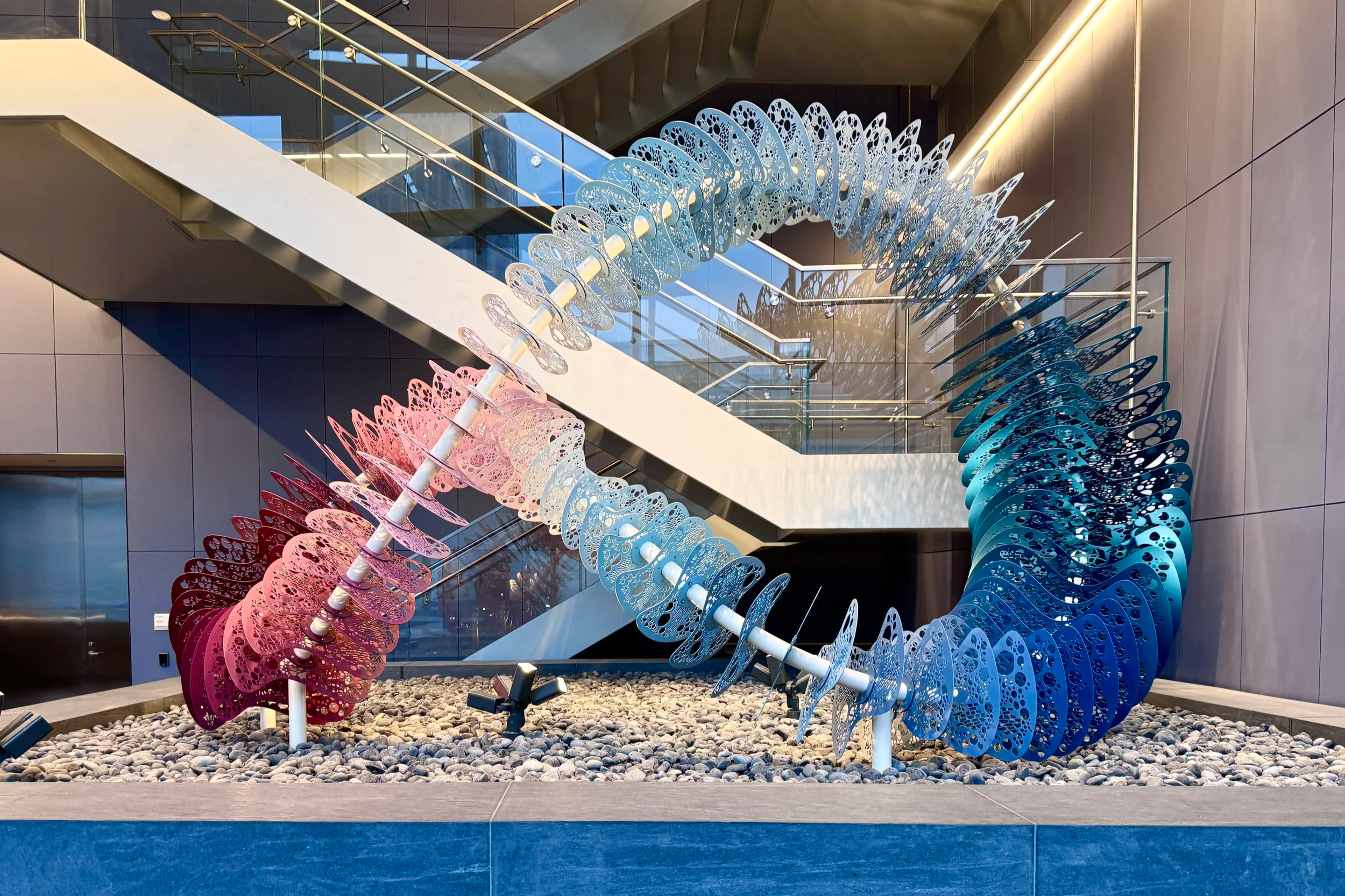 At the heart of the collection are 14 original commissions, each created exclusively for this project. These works, sculptures, interactive pieces, and dimensional wall installations are deeply embedded in the client's identity, reflecting the products and processes central to their manufacturing practice. Bold in scale and concept, the commissions anchor the program and set the tone for the spaces they inhabit.